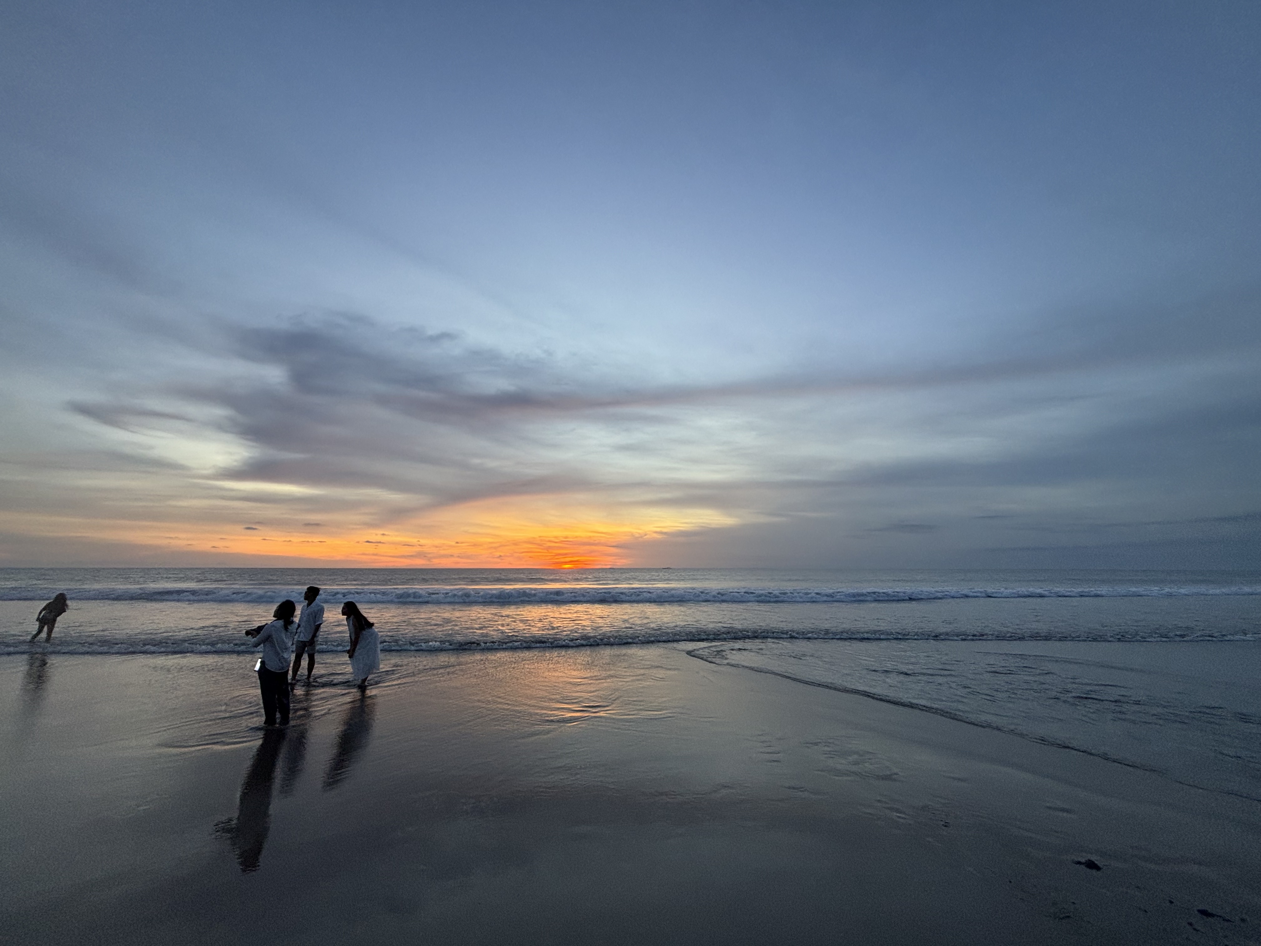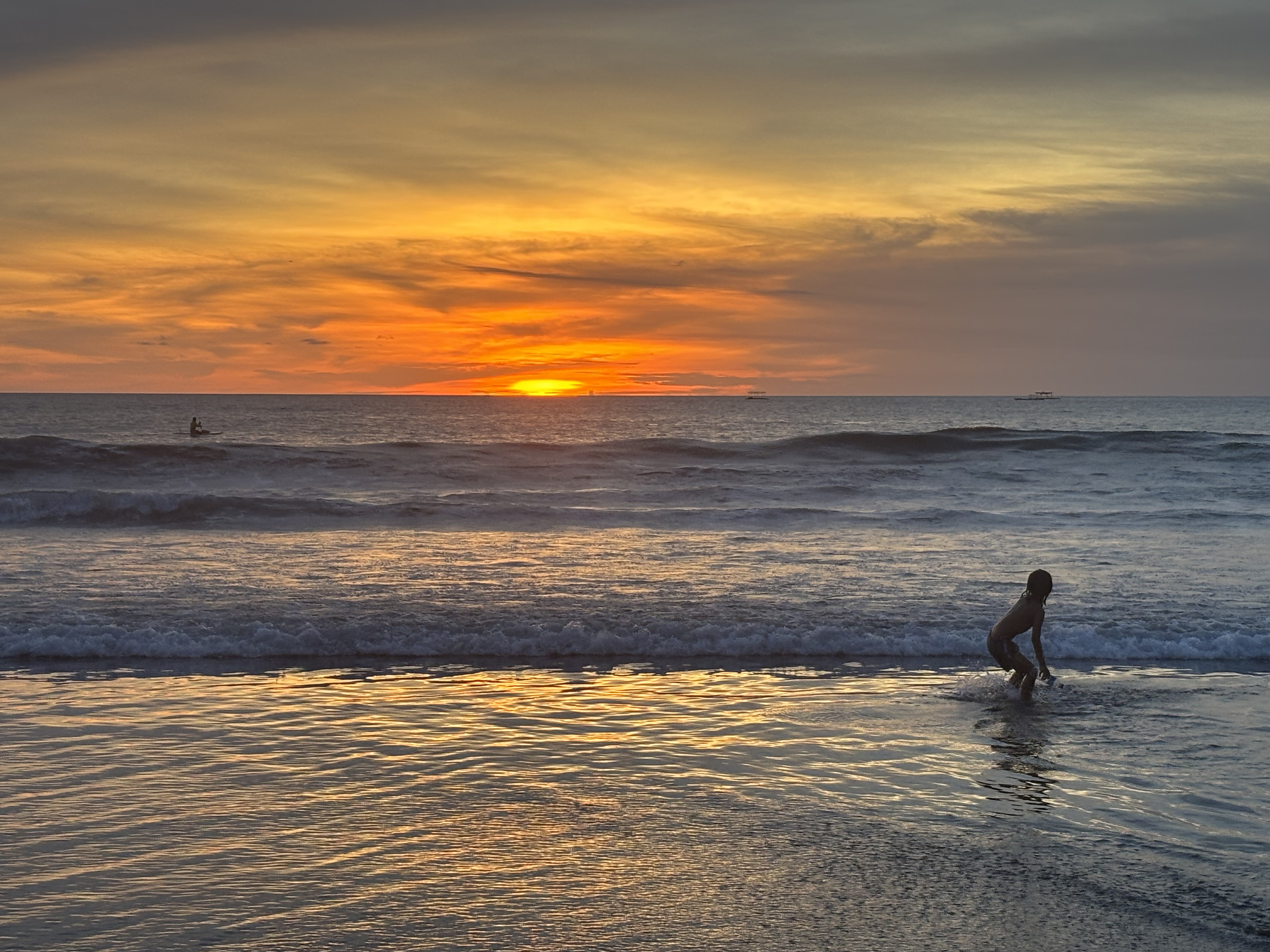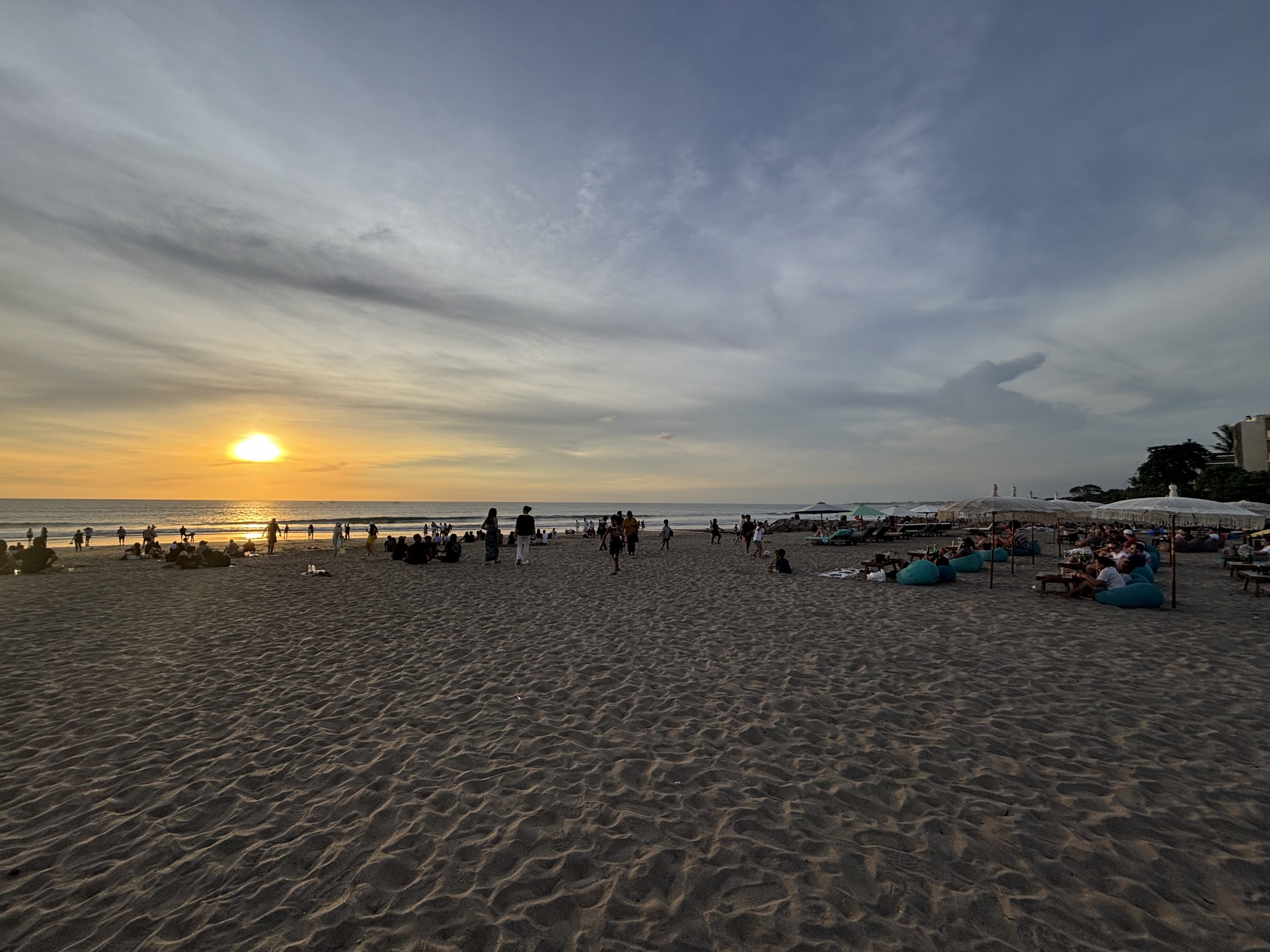 If you are contemplating a trip to Bali, keep in mind that the island lies merely 8 degrees south of the equator, so you can expect temperatures in the mid-to-high-eighties any time of year. Fortunately, cool breezes off the Indian Ocean make it quite tolerable on the western side of the island anytime you are near the beach. The rainy season supposedly runs from November through March, but my own rainy season experience was that it would pour down for a few minutes each afternoon and clear off quickly. I was lucky to have scheduled my stay over the Galungan holiday week, when schools and government offices were all closed, making it one of the least busy times of the year. It also meant that beachgoers were a roughly equal mix of locals and tourists. It made me smile to see local kids laughing and having fun on the beach with their new tourist friends as the waves crashed behind them. The sunsets were epic too.