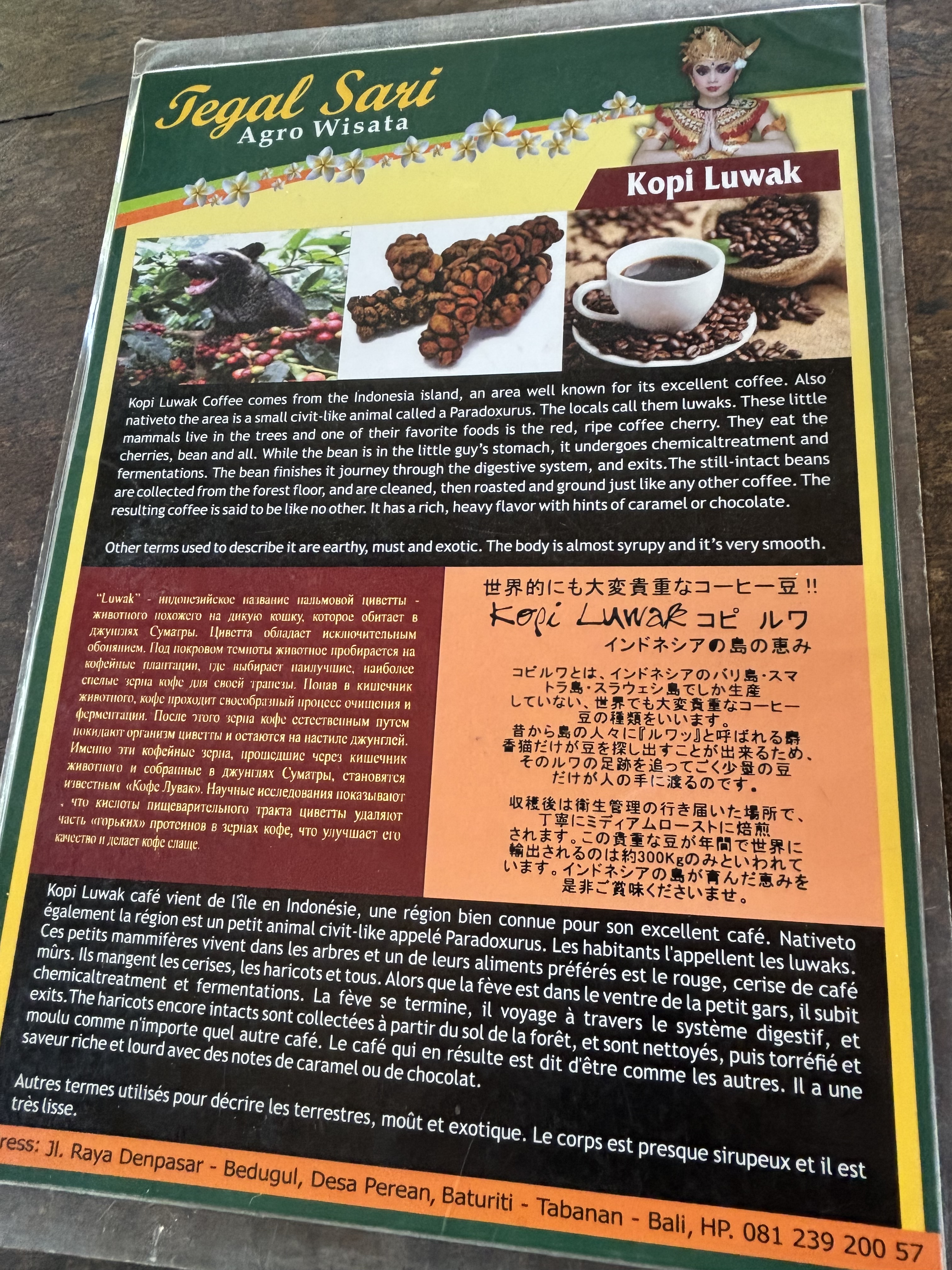 One highlight was a stop at a coffee plantation for a tea and coffee tasting. It was interesting to try the different varieties, but the stars of the show were the animals responsible for the prized beans. Luwaks are nocturnal (and quite adorable) mammals that typically are locked up in cages to sleep during the day because they have been known to eat animals as large as chickens when they can’t satisfy their hunger with their preferred vegetarian diet. They are let out at night to climb around coffee trees eating the berries. The luwaks swallow the berries whole, where the little fruits undergo a fermentation process in the stomach before being excreted whole. The berries are then collected, cleaned off, opened to reveal the beans inside and roasted like a normal coffee bean. Because they have been pre-fermented, they supposedly have less acid than regular coffee beans. I will admit to having been more than a little skeptical the first time someone asked if I’d had the “poop coffee” yet.